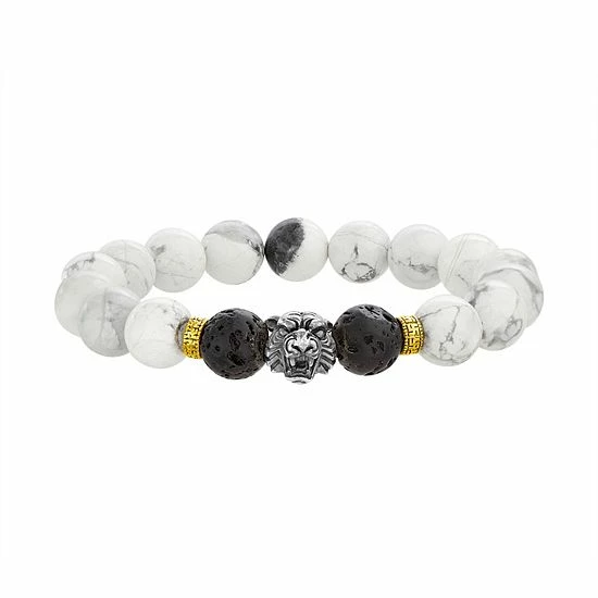 Made from lab-created howlite beads, lava beads, and a sterling silver tiger bead, this men’s stretch bracelet is a fierce addition to your casual attire.