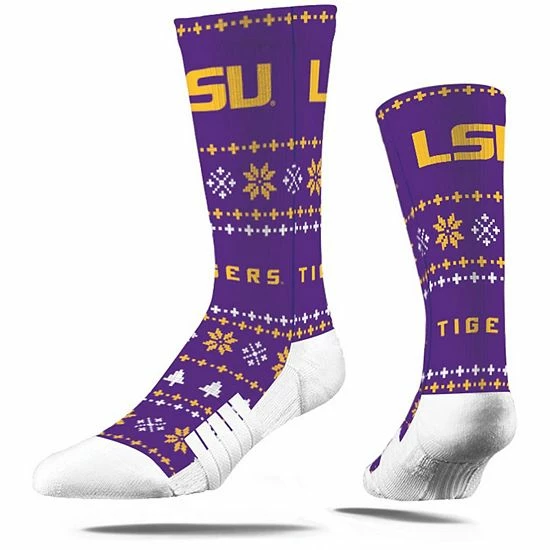 Gussy up your LSU Tigers spirit with a bit of holiday cheer with these Holiday crew socks. Strideline has crafted a comfortable pair of socks adorned with cheerful graphics in contrasting team colors. Complete with the LSU Tigers logo up top, these socks are a wonderful way to announce your fandom.
