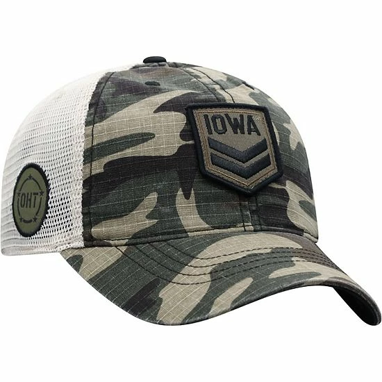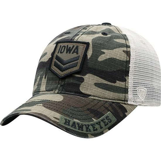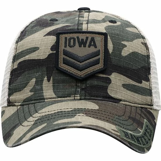 Display your Iowa Hawkeyes loyalty like a badge of honor when you put on this Shield Trucker hat from Top of the World. It features Iowa Hawkeyes graphics designed to coordinate with the OHT Military Appreciation symbol and camo pattern. An adjustable closure also lets you customize the fit, while mesh panels create a breezy feel.