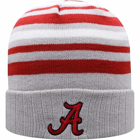 Make your Alabama Crimson Tide fandom more noticeable by sliding on this All Day cuffed knit hat from Top of the World. It features the Alabama Crimson Tide logo in raised embroidery and a striped design with a pop of team color. The stretch fit also provides a snug feel for continuous warmth.