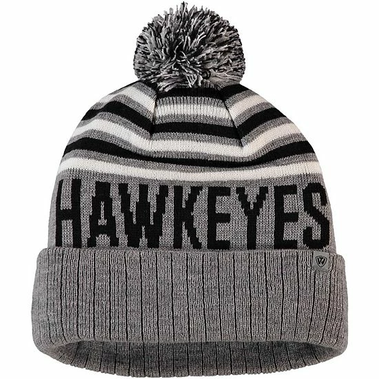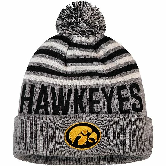 When cooler weather strikes, grab this Iowa Hawkeyes Ensuing cuffed knit hat. Featuring a fun pom on top, a brilliant design and bold Iowa Hawkeyes graphics, this sleek Top of the World cap will easily become your go-to for those cold days.