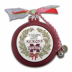 Combine your holiday spirit and your love of the Mississippi State Bulldogs with this Wreath Kickoff ornament. The beautiful painted graphics feature your team’s logo surrounded by a festive wreath. The ribbon and bell embellishments add a touch of style to this ready-to-hang ornament.