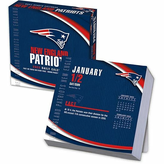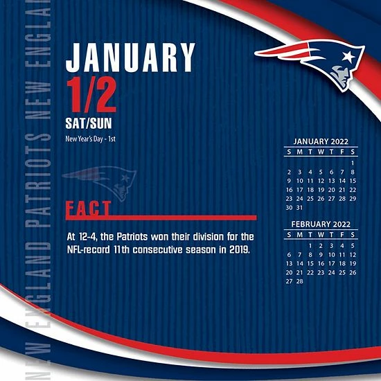Get a constant reminder of your New England Patriots fandom with this 2022 Box calendar. It features daily trivia or fun facts, scoring you extra points during the next New England Patriots event or watch party.