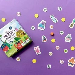 While a family is dining out, monsters are invading their house. Your role? Knock them down before the family comes back. You have a few tricks up your sleeves to counter the spells monsters throw back at you: hit them with socks, aim balls at them and drop bucket of water on their heads. No Mercy for Monsters is a cooperative game where players team up to knock down monsters before all the hidden tokens run out. Dexterity, memory and cooperation are the key to success.