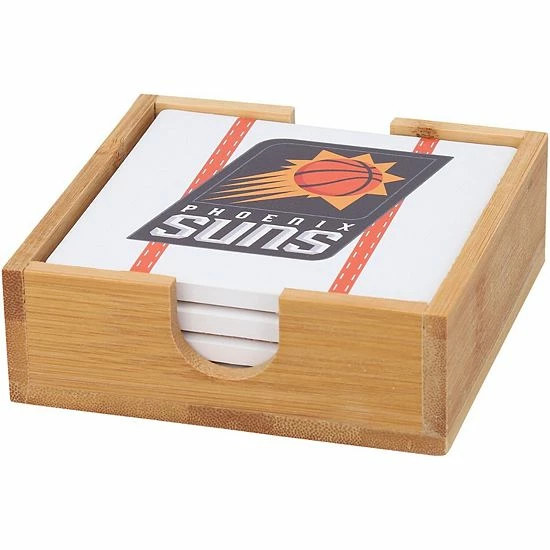 Keep your furniture safe while cheering on the Phoenix Suns with this Team Uniform coaster set. These stain-resistant coasters feature bold printed graphics that display your fandom in an understated way. Additionally, the set comes with a wooden caddy to keep everything together when not in use.