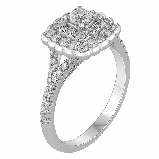 Crafted from platinum, and adorned with tiers of scintillating diamonds, this cushion halo engagement ring will take her breath away.
