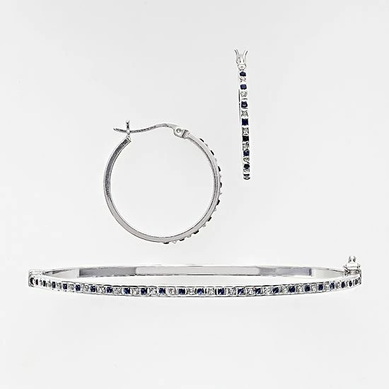 Timeless glamour. Featuring sapphire stones and diamond accents, these hoop earrings and bangle bracelet provide delightful sparkle. For instant sophistication, wear these platinum-over-sterling silver pieces alone or together.