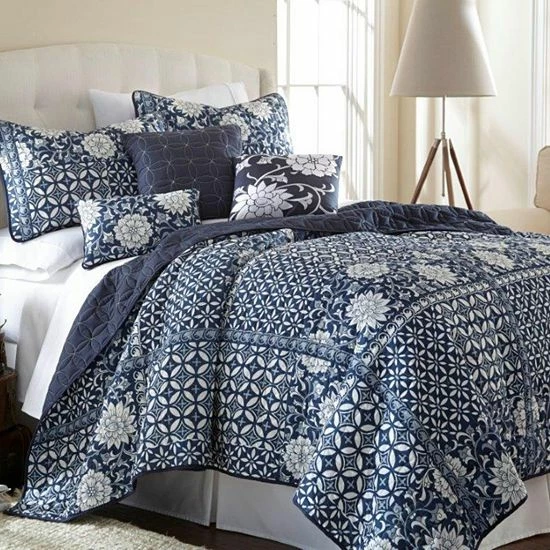 Create a classically refined sleep setting with this reversible Zion quilt set. In blue.
