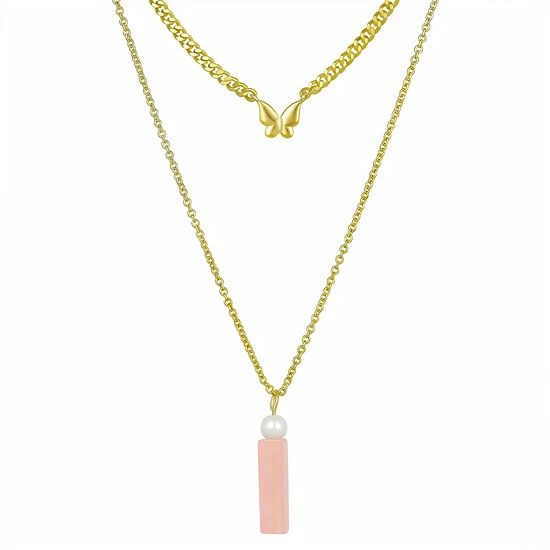 With its shiny gold-tone butterfly charm and eye-catching rose quartz gemstone, this layered necklace is sure to turn heads.
