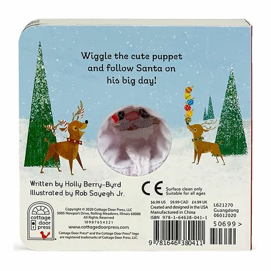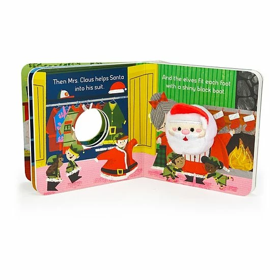 A rhyming story featuring a soft, plush finger puppet toy built into the book encourages interactive play and hand-eye coordination in this Santa’s Big Day Finger Puppet Board Book.