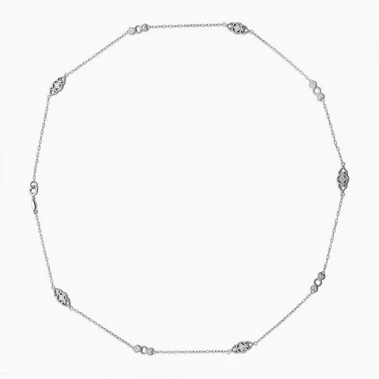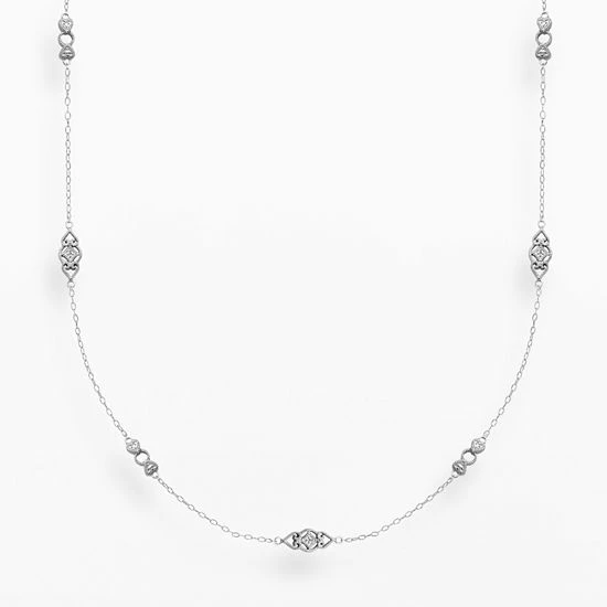 This silver-plated station necklace features beautiful diamond accents and an open-worked design, making it one you’ll cherish for a lifetime.
