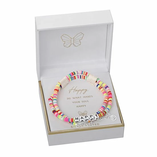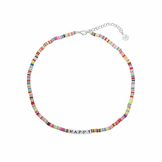 Spread some joy with this silver-plated “Happy” multicolor disc bead necklace.