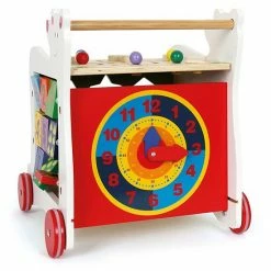 This baby walker by Small Foot provides early training motor skills and logical thinking. The wooden toys feature assigning colors, recognizing shapes, doing creative painting and learning how to tell time.