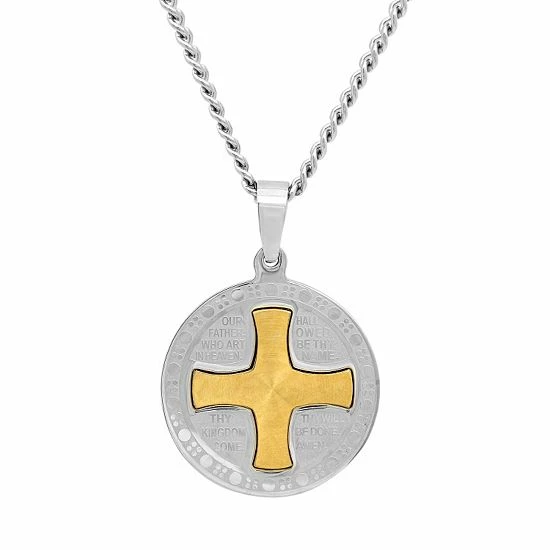 Showcase your beliefs with the modern design of this medal pendant. Designed with the Lord?s Prayer motif and a yellow ion-plated stainless steel cross accent, this medal necklace is sure to inspire those around you.