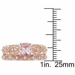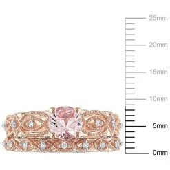 This 10k rose gold morganite engagement ring set is a breathtaking symbol of your love and commitment. Its intricate filigree motif is beautifully adorned with diamond accents and milgrain details.