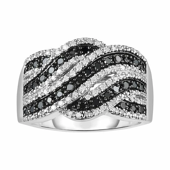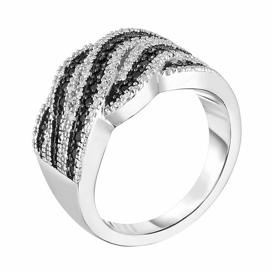 Decorated with interwoven rows of black and white diamonds, this sterling silver ring is sure to dazzle.
