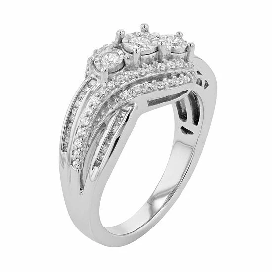 Featuring illusion-set diamonds and a breathtaking three-stone motif, this sterling silver ring is sure to impress.