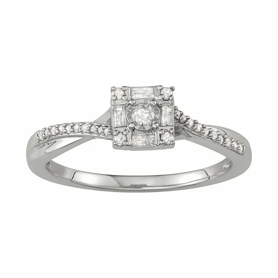 Featuring a square frame of round- and baguette-cut diamonds set atop a twisted band, this sterling silver ring offers a unique look that is sure to captivate.