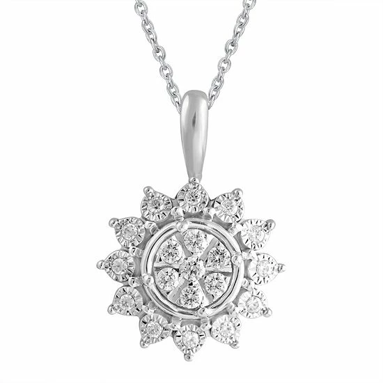 This gorgeous sterling silver diamond sunburst pendant necklace is the perfect way to finish any outfit.