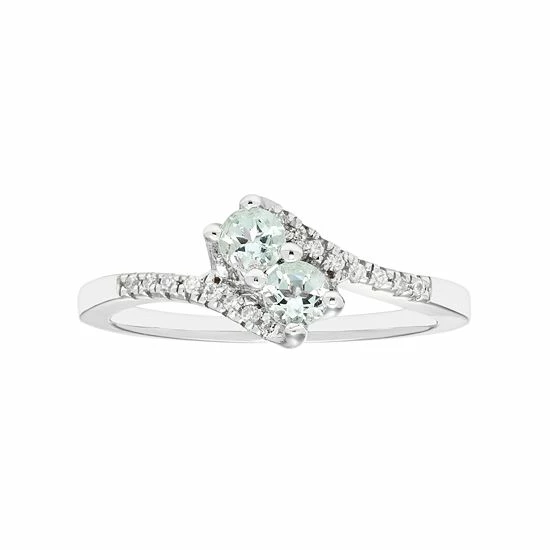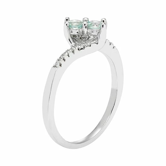 Diamond accents showcase the dual aquamarine stones at the center of this sterling silver bypass ring’s marvelous design.