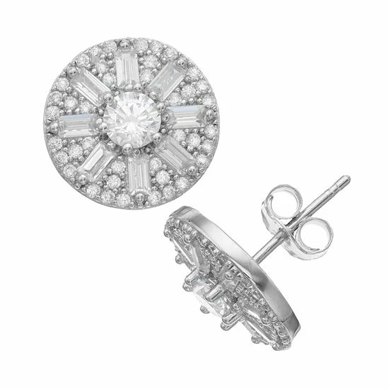 Round- and baguette-cut cubic zirconia gemstones make these sterling silver stud earrings an elegant accent to any outfit.