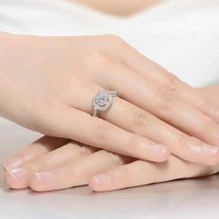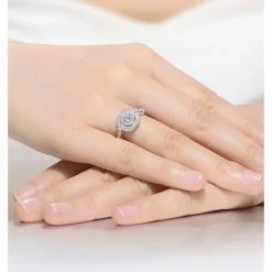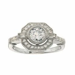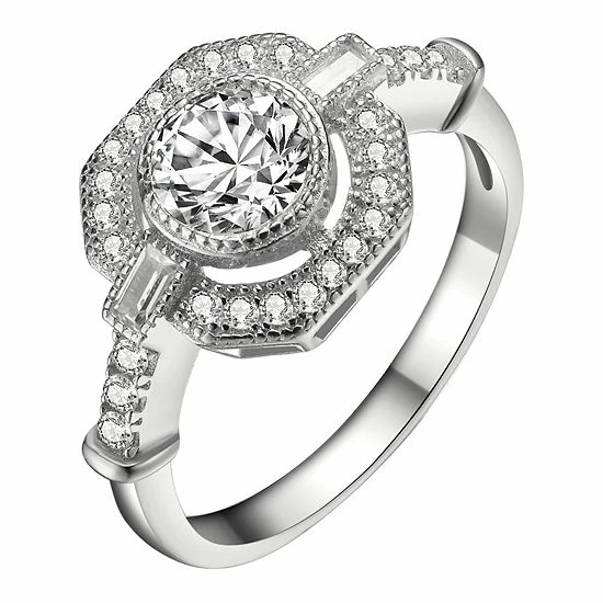 Beautifully adorned with dazzling round- and baguette-cut cubic zirconia gemstones, this sterling silver halo engagement ring is a stunning symbol of your love.