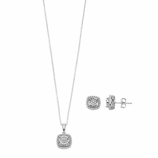 You’re sure to love the subtle elements of this sterling silver pendant and stud earring set. It features clusters of diamond accents set in a miracle-plate setting. Milgrain and filigree details complete this fashionable pair.