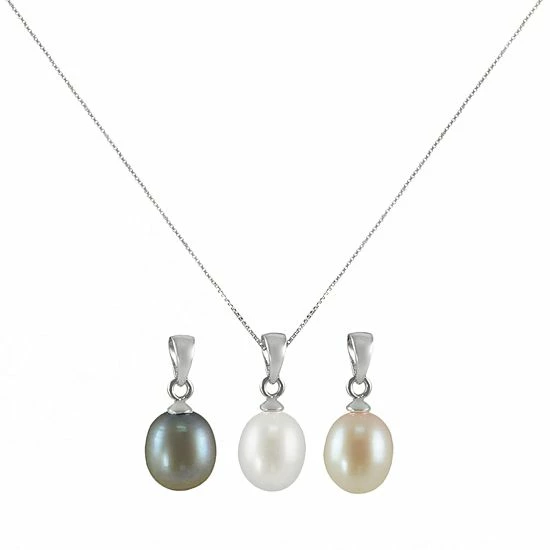Elevate any ensemble with this sterling silver necklace. Three interchangeable freshwater cultured pearl pendants make it the perfect choice for every look. You’ll light up the room wearing this lovely pendant set.
