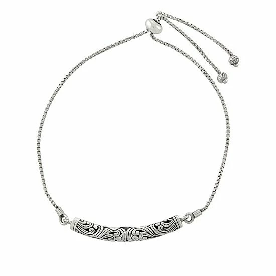 Add some bohemian charm to your wardrobe with this sterling silver filigree bar bolo bracelet.