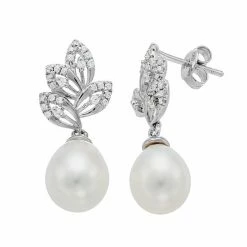 Decorated with lustrous freshwater cultured pearls and shimmering cubic zirconia accents, these sterling silver leaf drop earrings abound with natural beauty.
