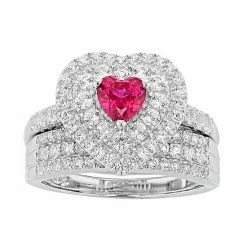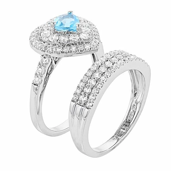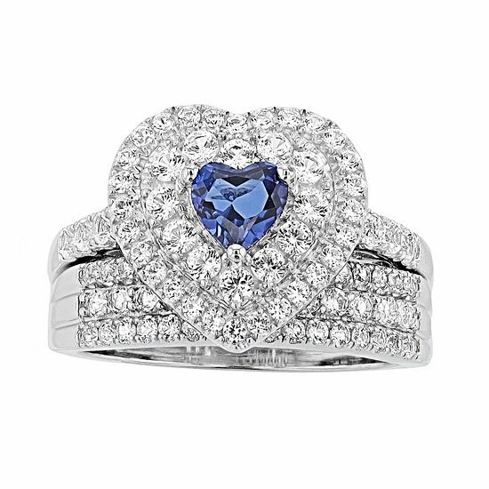 Decorated with a heart-shaped gemstone accented with dazzling lab-created white sapphire accents, this engagement ring and matching wedding band set is a breathtaking way to express your love.
