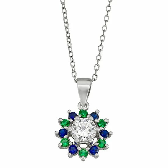 Featuring a dazzling cubic zirconia center stone beautifully complemented by blue and green lab-created spinel accents, this sterling silver pendant provides an eye-catching touch of color to your ensembles.