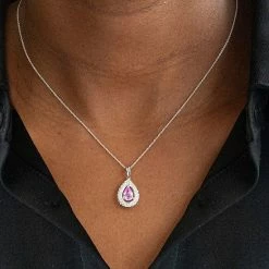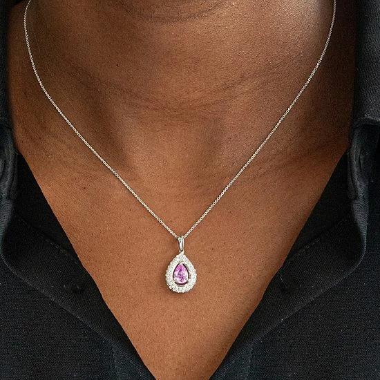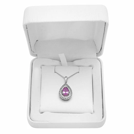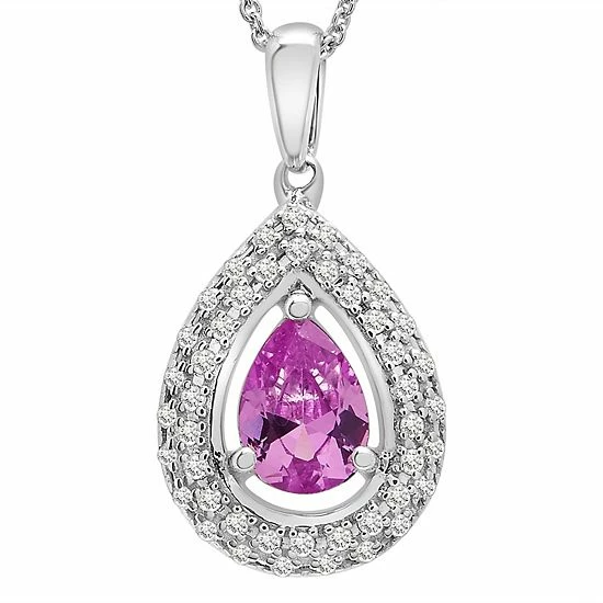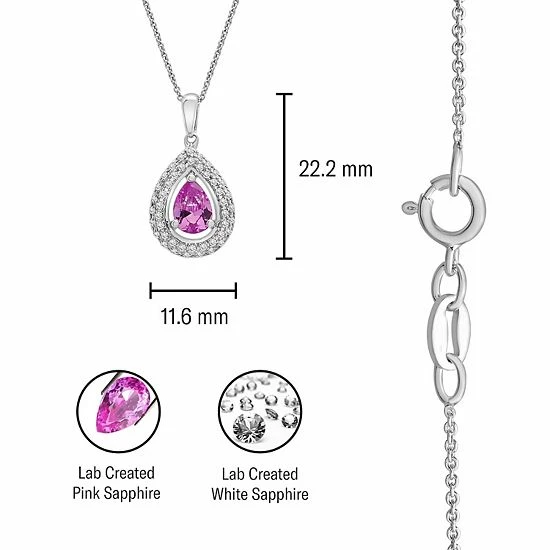 Adorned with lab-created pink and white sapphire stones, this teardrop pendant is absolutely dazzling.