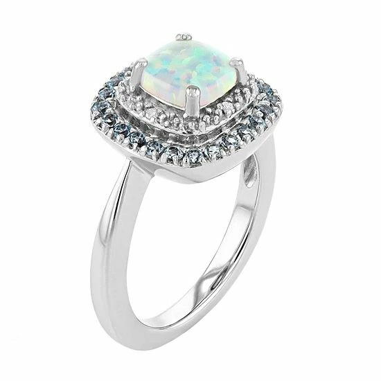 This gorgeous sterling silver lab-created white opal, blue topaz and diamond accent square ring is a must-add to your fine jewelry collection.