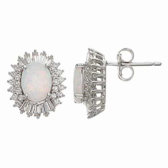 Featuring oval-cut, lab-created white opal center stones set within halos of lab-created white sapphire accents, these sterling silver stud earrings add a scintillating touch to your ensembles.