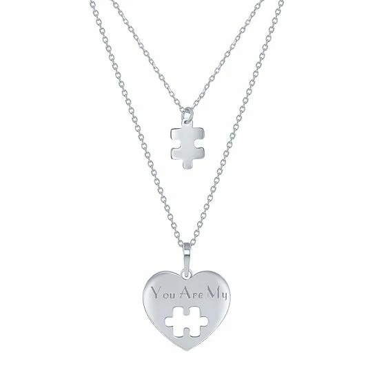 This adorable sterling silver puzzle piece and “YOU ARE MINE” heart necklace set is the perfect way to remind yourself of the person who completes your heart.