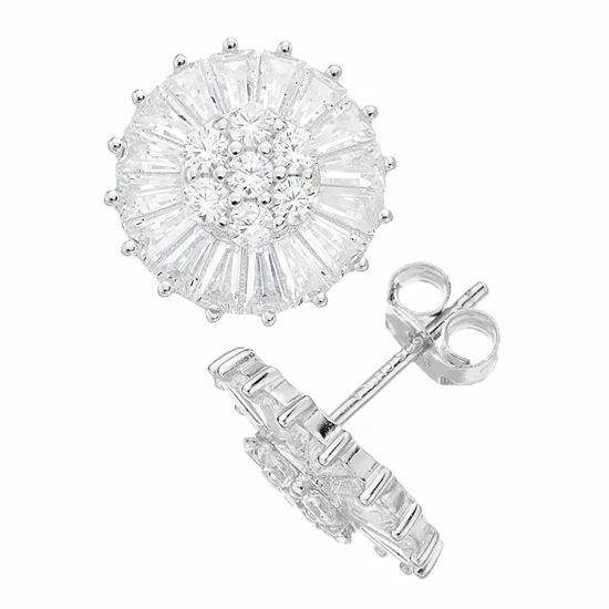These stunning cubic zirconia halo stud earrings feature both baguette and round cut stones, adding a touch of eye-catching texture to a classic, vintage-inspired piece.
