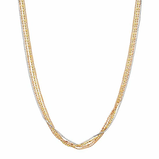 A beaded chain and tri-color design makes this sterling silver. adjustable necklace a versatile accessory.