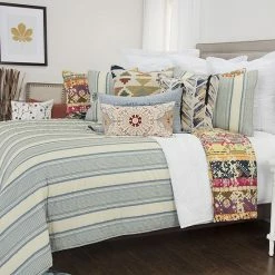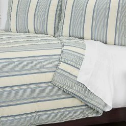 - This quilt features the same complex stripe printed pattern on each side. It is then hand quilted using a channel stitch pattern to follow the linear movement of the stripes. The shams are included and feature the same print and stitch patterning. The shams also feature a solid coordinating cotton back that is split for ease of fill and removal of fill for laundering.