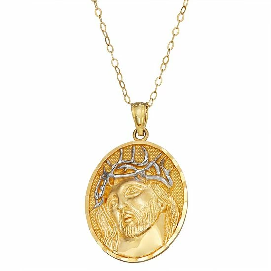 Keep Jesus close to your heart whenever you wear this two-tone 10k gold Jesus crown of thorns necklace.