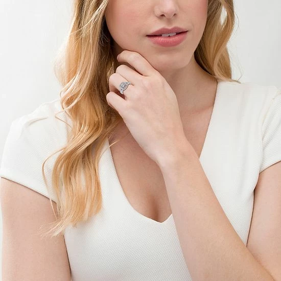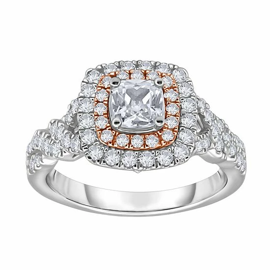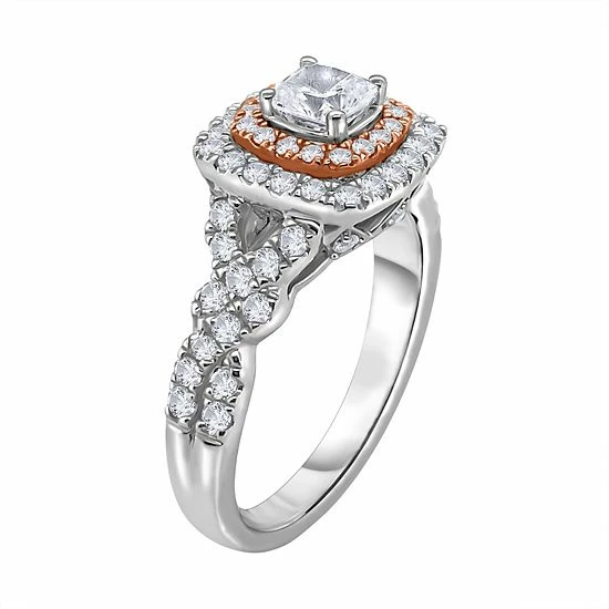 Beautifully adorned with scintillating, round-cut diamonds, this two-tone halo engagement ring showcases your unending love.