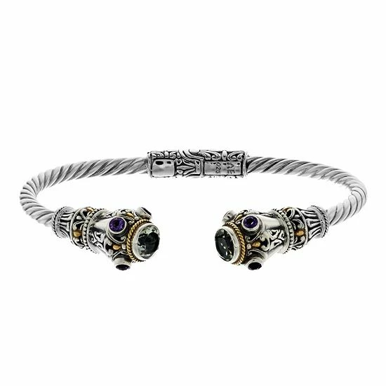 Featuring a Bali-inspired design decorated with amethyst and mint quartz gemstones, this sterling silver bangle bracelet will enhance your favorite ensembles.