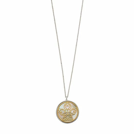 A mother-of-pearl angel disc pendant gives this two-tone necklace graceful beauty.