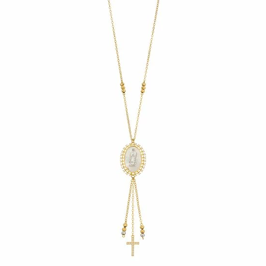 Divine style abounds with this mother-of-pearl Virgin Mary and cross pendant necklace.