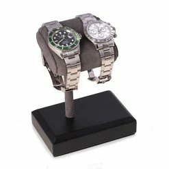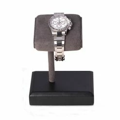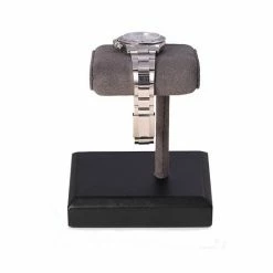 - This contemporary piece is comprised of a matte black leather stand with a grey felt neck and cushion to best show your timepiece