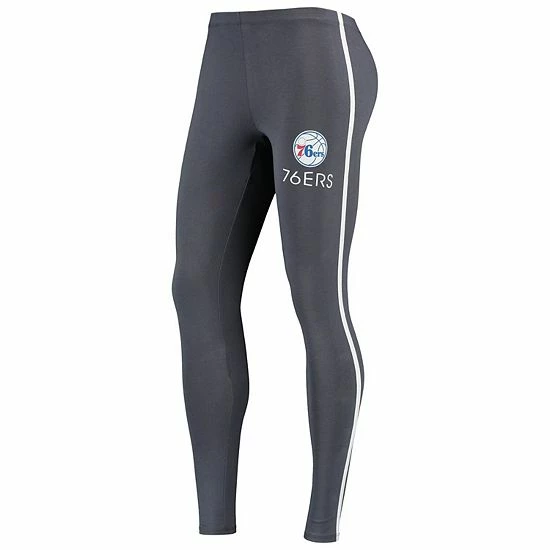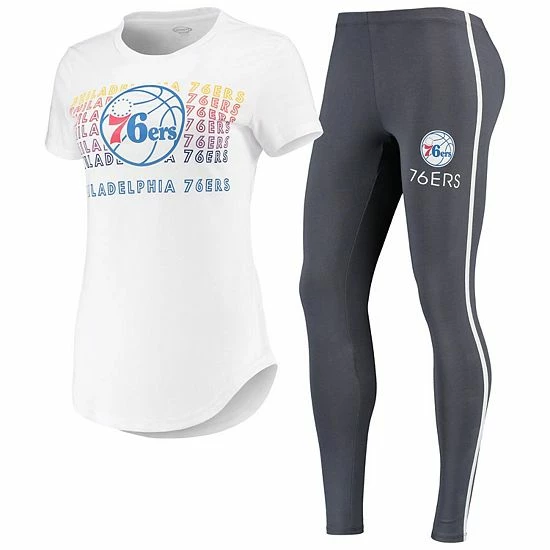 Head off to the gym or to run errands in this comfortable Sonata T-shirt and leggings set from Concepts Sport. The top made out of soft, flowy material features the Philadelphia 76ers name repeating in vibrant colors and a rounded hem for a more relaxed fit. On the bottoms, an elastic waistband provides a flexible feel and sewn-on stripes accentuate the printed Philadelphia 76ers graphics.