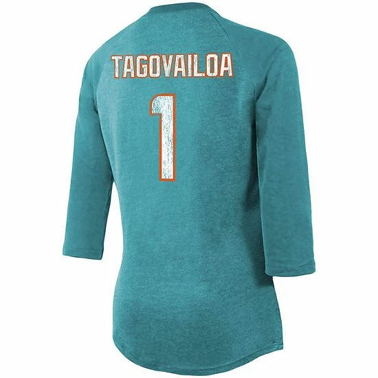 Display your loyalty to Tua Tagovailoa with this Miami Dolphins Player Name and Number 3/4-sleeve Tri-blend T-shirt from Fanatics Branded. Its vintage-looking graphics feature the Miami Dolphins logo printed on the front and a jersey-like Tua Tagovailoa design on the back. Also, the raglan sleeves will give you greater flexibility for a more comfortable fit.