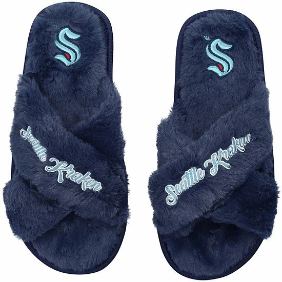 Kick your feet up and relax during the Seattle Kraken game with these Script Cross slide slippers from FOCO. Made with soft faux fur with a textured bottom, these slippers are perfect for comfortably enjoying the game from home. Not to mention their embroidered graphics and team colors help you show your continued support of the Seattle Kraken.