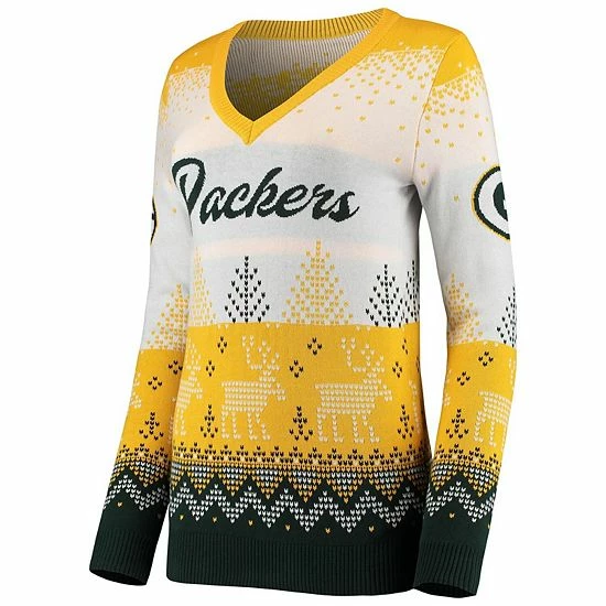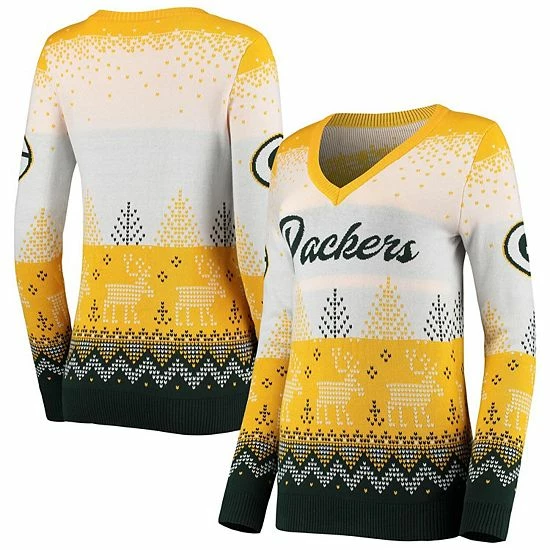 Be the MVP of the ugly sweater party with this V-neck version from FOCO. It features festive Green Bay Packers graphics, including the team name on the chest and the iconic logo on each sleeve. Designed with cozy cotton, this pullover stylishly combines your team spirit and holiday cheer.