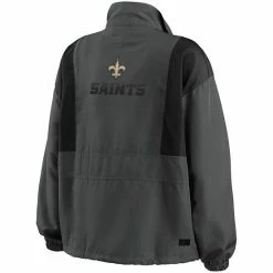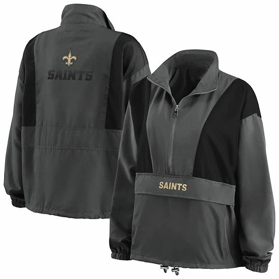 Support your New Orleans Saints with a functional piece of outerwear this season, the Popover Packable half-zip jacket from WEAR by Erin Andrews. Along with elastic cuffs and an adjustable waist hem, it features a half-zip closure and Olympic collar for maximum coverage. New Orleans Saints graphics are displayed on both the front and back for a constant showcase of your favorite team.